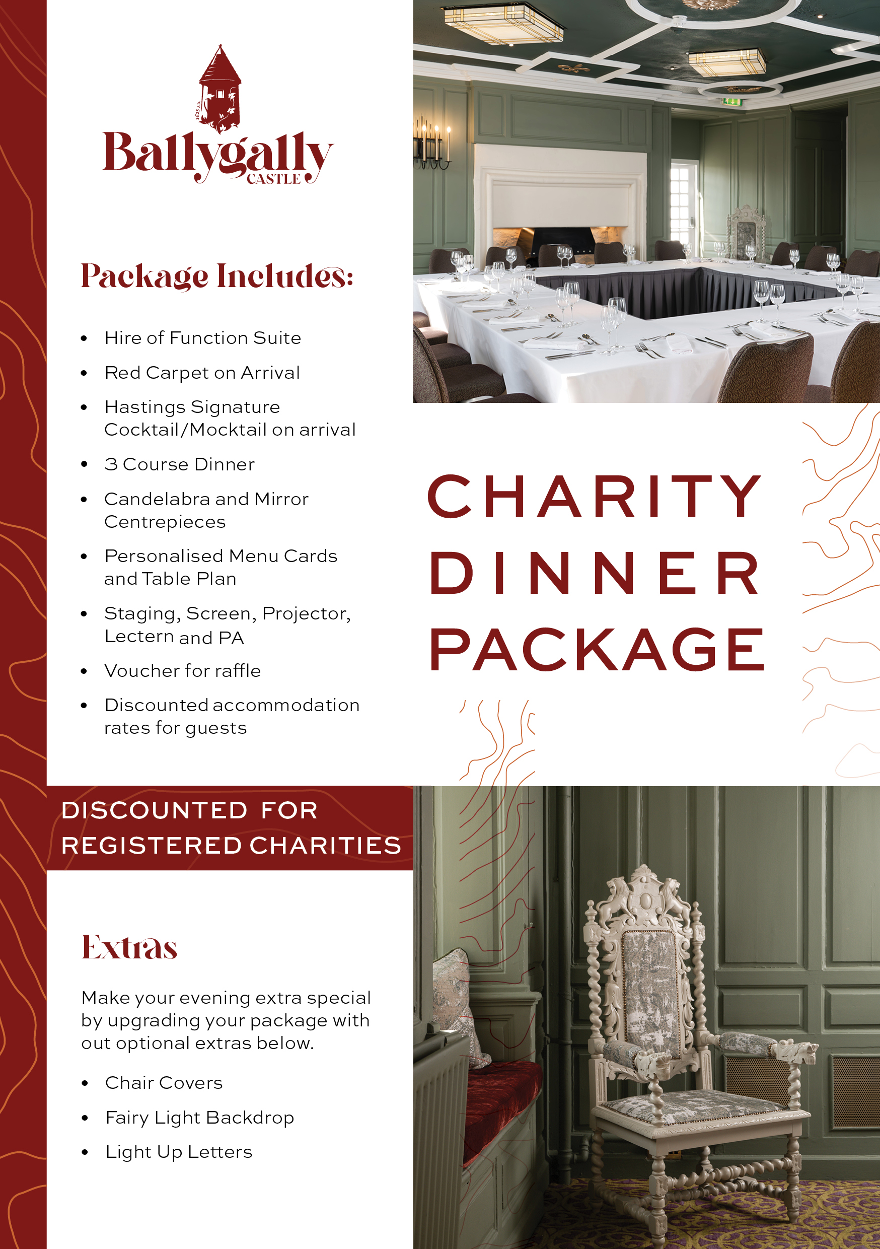 From the moment your guests step through our doors, they’ll be swept up in the magic of the Castle. Be greeted by a red carpet entrance and a signature Hastings cocktail or mocktail to set the tone for the evening ahead. With the stunning surroundings of the Antrim Coast, carefully prepared cuisine, and personalised touches throughout, we’ll make sure every moment feels as special as the cause you’re championing.
