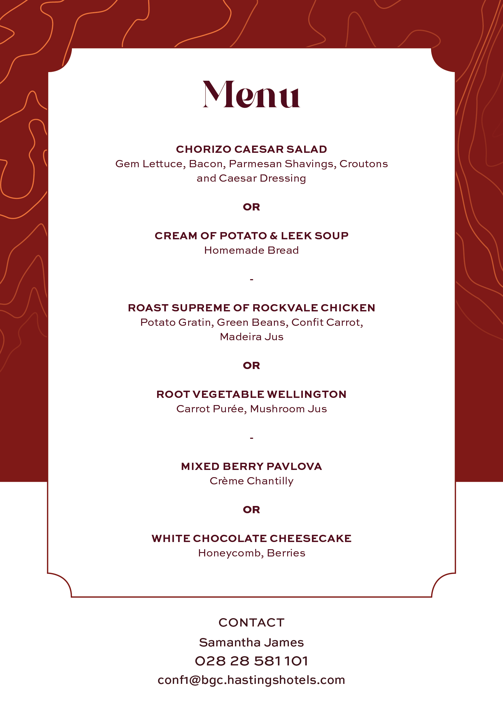 To make an enquiry, please contact us on +44 (0)28 2858 1066 or email conf@bgc.hastingshotels.com.